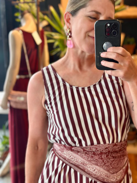 Vestido largo hasta el tobillo sin mangas, en poplín rayado bordó y blanco. Detalle que amamos..si! tiene bolsillos!